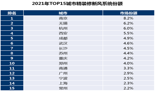 從區(qū)域分布來看,2021年華東是精裝修新風(fēng)系統(tǒng)配套的主力區(qū)域,建議重點深耕一二線市場的核心城市。2021年,我國精裝修新風(fēng)系統(tǒng)配套規(guī)模最高的地區(qū)為華東,市場份額為48%;華南和華中緊隨其后,說明新風(fēng)系統(tǒng)在一二線市場項目中配套較多,比較受開發(fā)商歡迎;2021年,從城市分布來看,南京、無錫、杭州、西安、成都是全國精裝修新風(fēng)系統(tǒng)配套量TOP5的城市,未來隨著都市圈和城市群的推進(jìn),新一線市場仍然是新風(fēng)重點布局的市場。