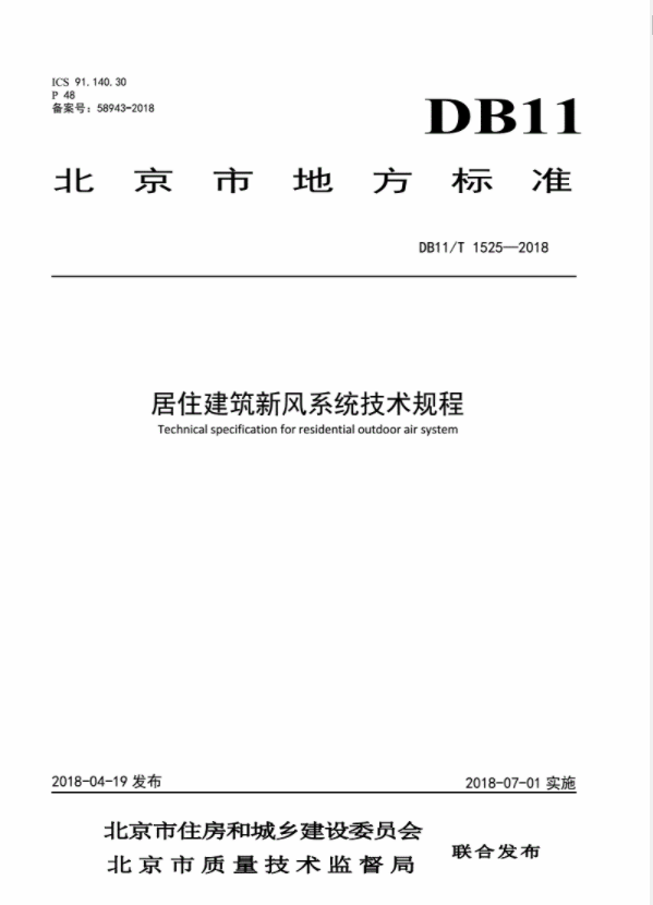 經(jīng)北京市質量技術監(jiān)督局批準,北京市質量技術監(jiān)督局、北京市住房和城鄉(xiāng)建筑委員會共同發(fā)布的《居住建筑新風系統(tǒng)技術規(guī)程》于2018年7月1日正式開始實施。該標準的實施,對北京地區(qū)新風系統(tǒng)應用提出了標準性指導方法,對其他省市規(guī)范居住建筑新風系統(tǒng)的設計、施工、驗收和運行維護具有指導作用。
